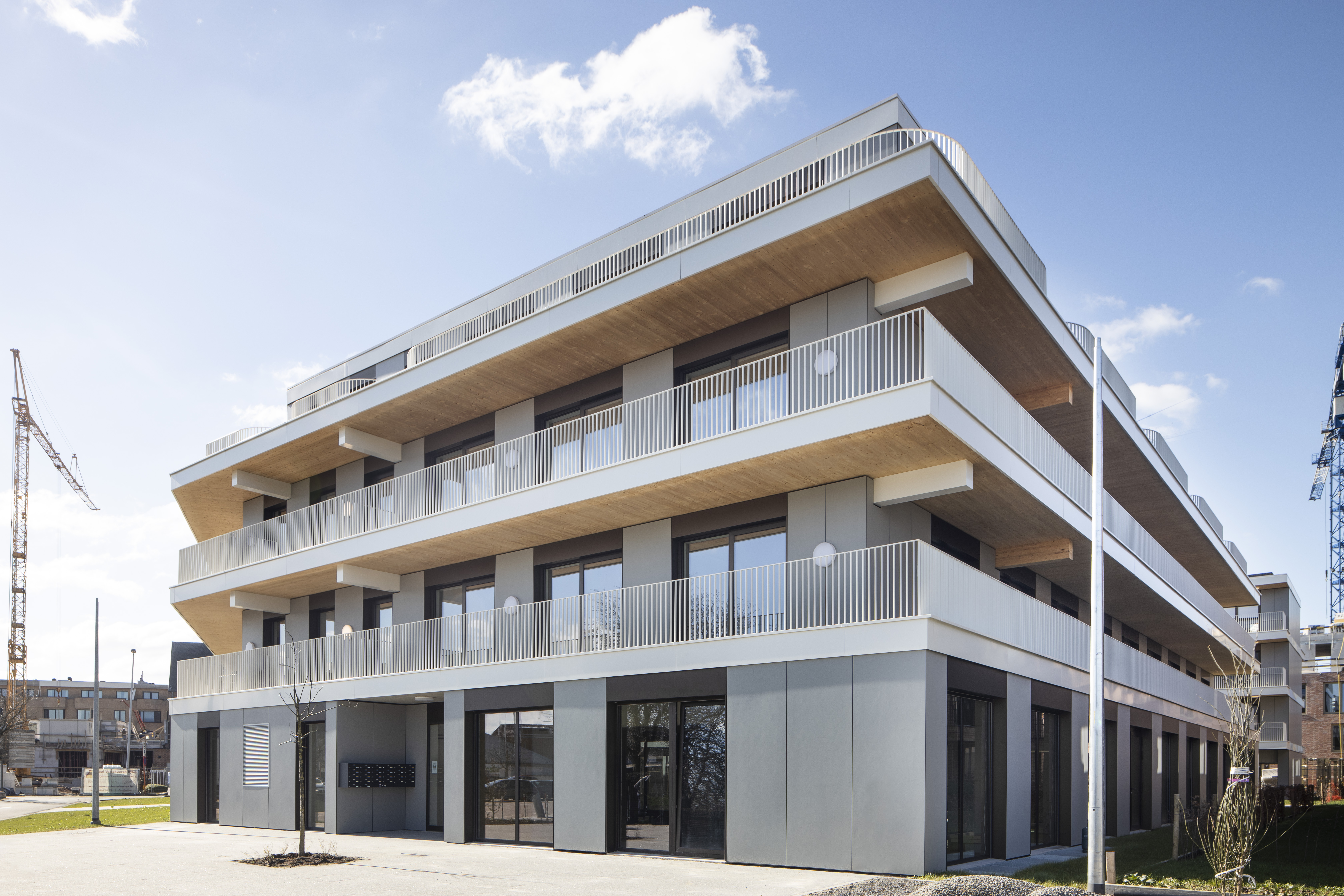 Welke leerpunten neemt Michiel mee naar zijn volgende projecten? “Een eerste leerpunt is dat ik nog sneller de CLT-fabrikant bij het ontwerp moet betrekken. Die weet precies wat kan en niet kan. Mijn tweede leerpunt sluit daarbij aan: als het aan mij ligt, bouwen we voortaan alles in CLT. Bij de vorige projecten hebben we ook nog andere technieken gebruikt. Bijvoorbeeld de kolommen en liftschachten zijn van beton. Het gebouw in Geel dat het dichtste bij het treinspoor ligt, is ook niet in CLT, omdat we bang waren voor de akoestiek. Maar intussen zijn we 7 à 8 jaar verder en is het materiaal geëvolueerd. Als de fabrikant dan van bij de start mee in het ontwerp zit, trekken we CLT – en dus duurzaamheid – nog radicaler door.”